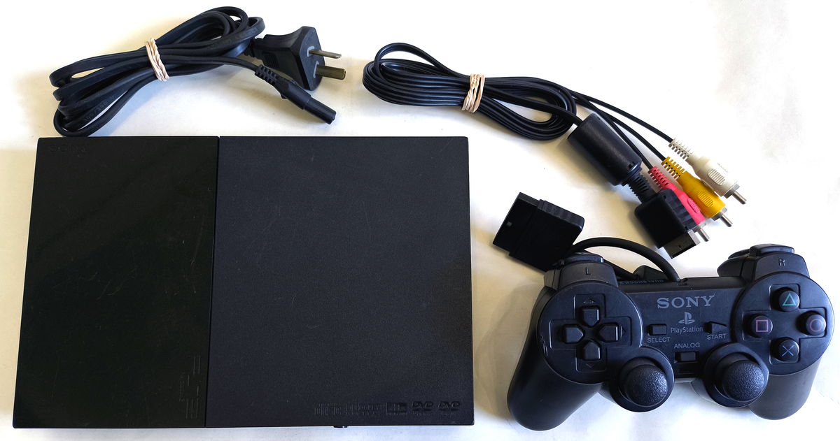 Consola PlayStation 2 Slim con lente impecable y chipeada. Modelo SCPH-90001. Incluye Dualshock 2, Cable A/V Original y Cable A/C. Estado estético excelente y funcionando correctamente.