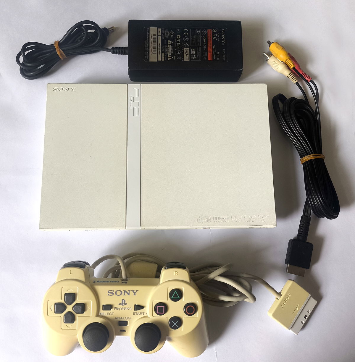 Consola PlayStation 2 Slim con lente impecable y chipeada. Modelo SCPH-7501 "Ceramic White". Incluye Dualshock 2, Cable A/V Original y Trafo. Estado estético excelente y funcionando correctamente.